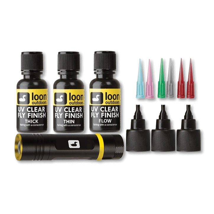 With everything a tyer needs to make the move from traditional cements to UV Cure, the UV Fly Tying Kit includes UV Clear Fly Finish Thick, Thin and the brand new, ultra-thin Flow, and a UV Bench Light.